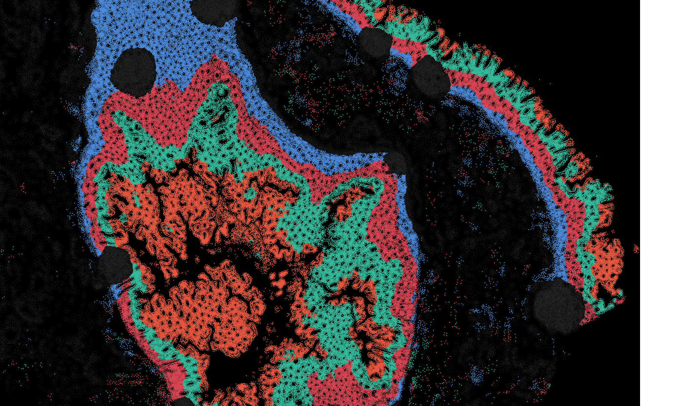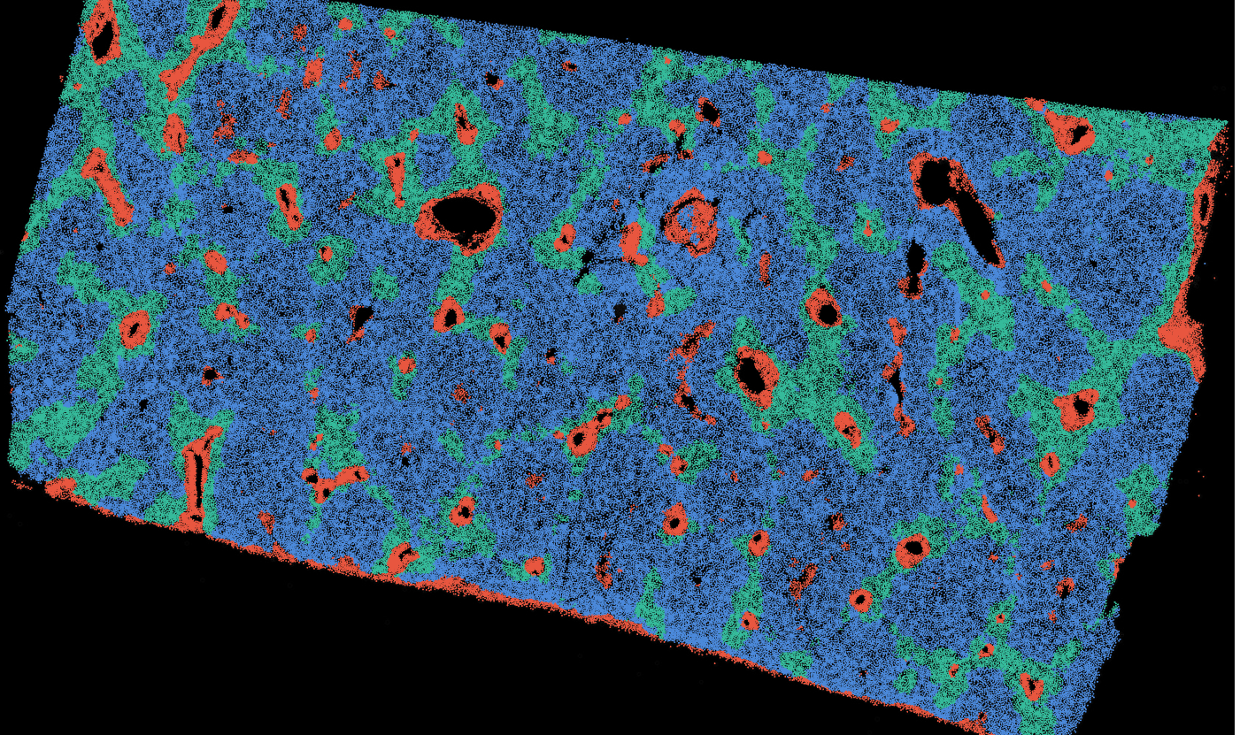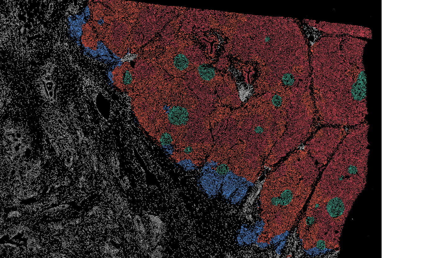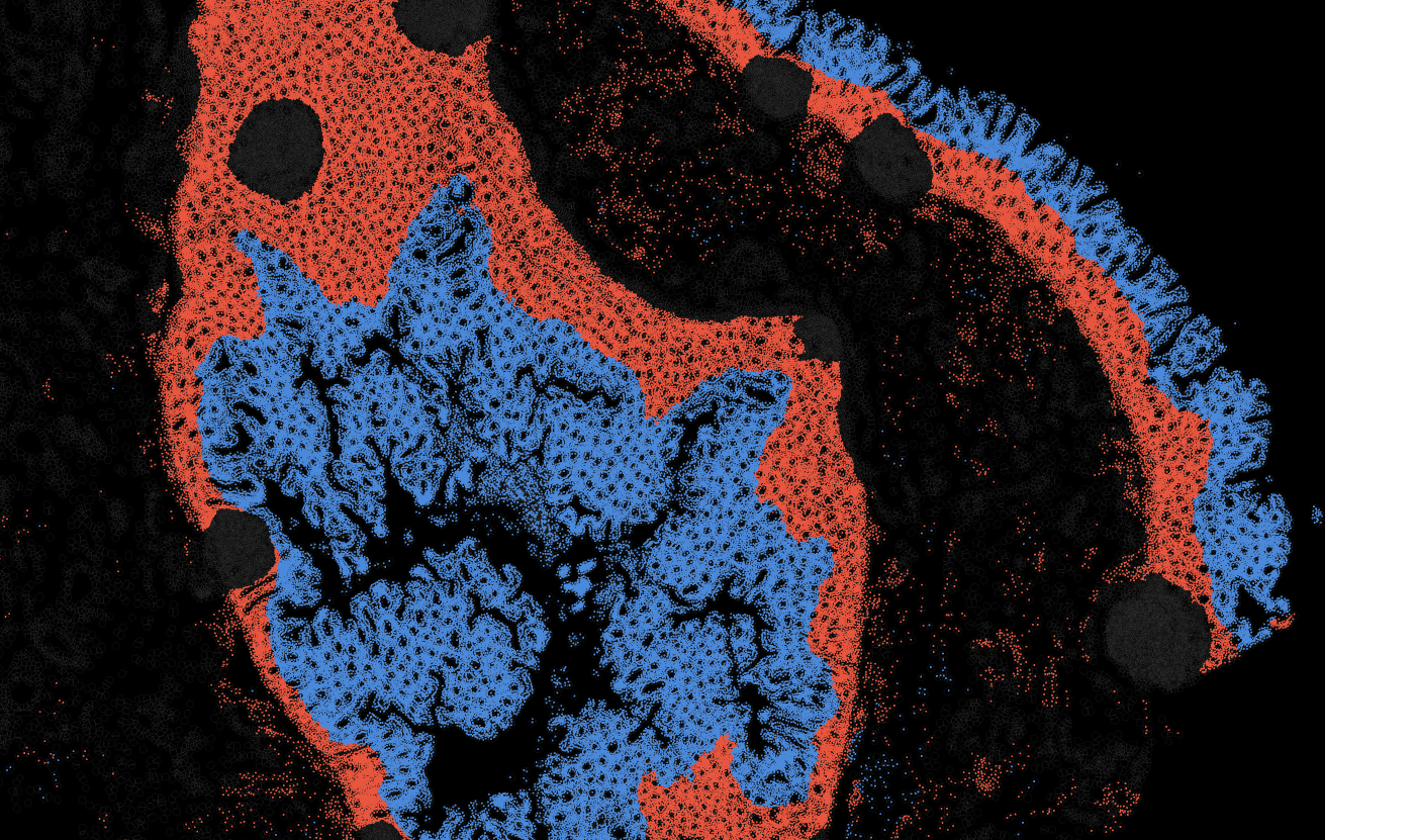 The segmentation module is designed to help researchers explore tissue architecture at multiple levels of detail, depending on their scientific question. Users can begin by dividing the tissue into major anatomical structures to gain a broad overview of the spatial landscape. From there, they can zoom into a specific region of interest and further segment it into sub-tissue compartments, enabling more refined analysis of microenvironments and localized biological processes.